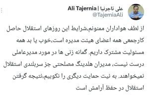 او در بخشی از پیام خود نوشته است که وضعیت کنونی استقلال نتیجه تلاش جمعی همه اعضای هیات مدیره است و تصمیمات مدیریتی تنها با هدف موفقیت و آرامش تیم اتخاذ میشود.