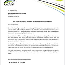 به گزارش پایگاه خبرگزاری ورزش۹۱ورزشی موفقیت تاریخی تیم ملی راگبی زنان ایران در رقابتهای آسیایی مسقط واکنش رسمی رئیس کنفدراسیون راگبی آسیا را به دنبال داشت و او در پیامی خطاب به مسئولان این رشته در ایران، عملکرد تیم را دستاوردی ارزشمند و حاصل تلاش منسجم بازیکنان و کادر فنی توصیف کرد. در این پیام اشاره شده است که مسیر رسیدن به این نتیجه با وجود موانع داخلی کار سادهای نبوده اما روحیه تیمی و اراده بازیکنان نقشی تعیینکننده در دستیابی به این جایگاه داشته است.